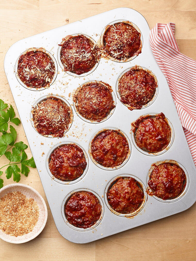 Divide the lamb mixture evenly among the 12 wells of the muffin tin and spoon a bit of the smoky tomato glaze over the top. Place the tin in the oven and bake for 15 minutes.