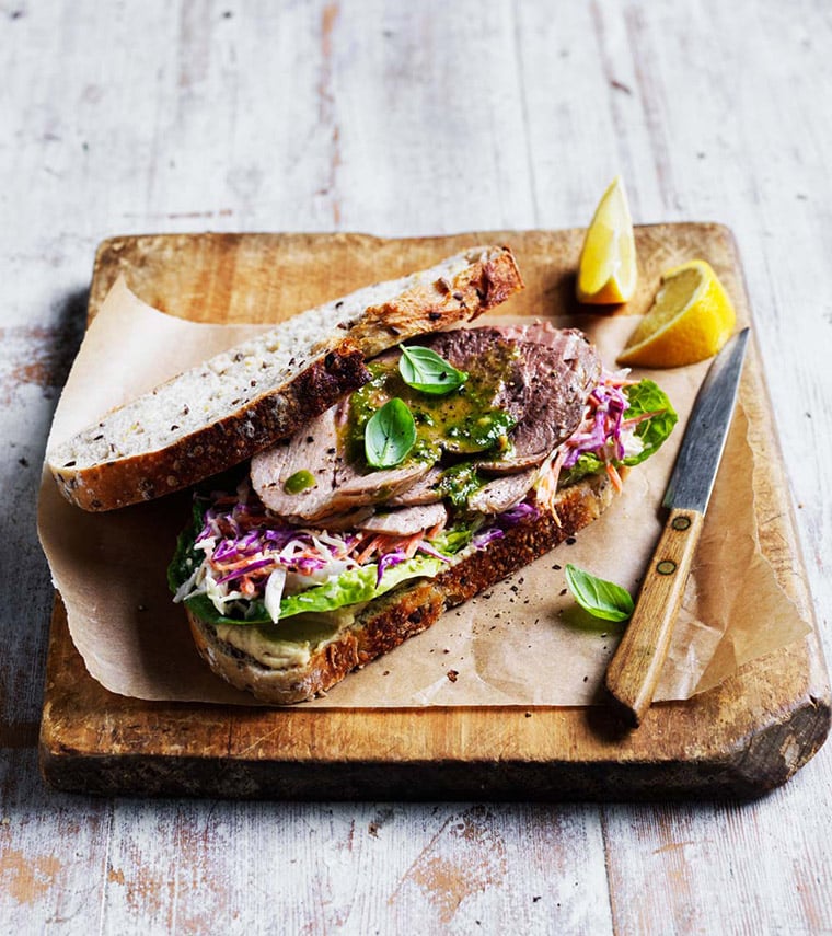 Spread each slice of bread with hummus. Top with lettuce, cabbage salad and lamb. Spoon over pesto, season with pepper. Sprinkle with basil leaves. Serve with lemon wedges.