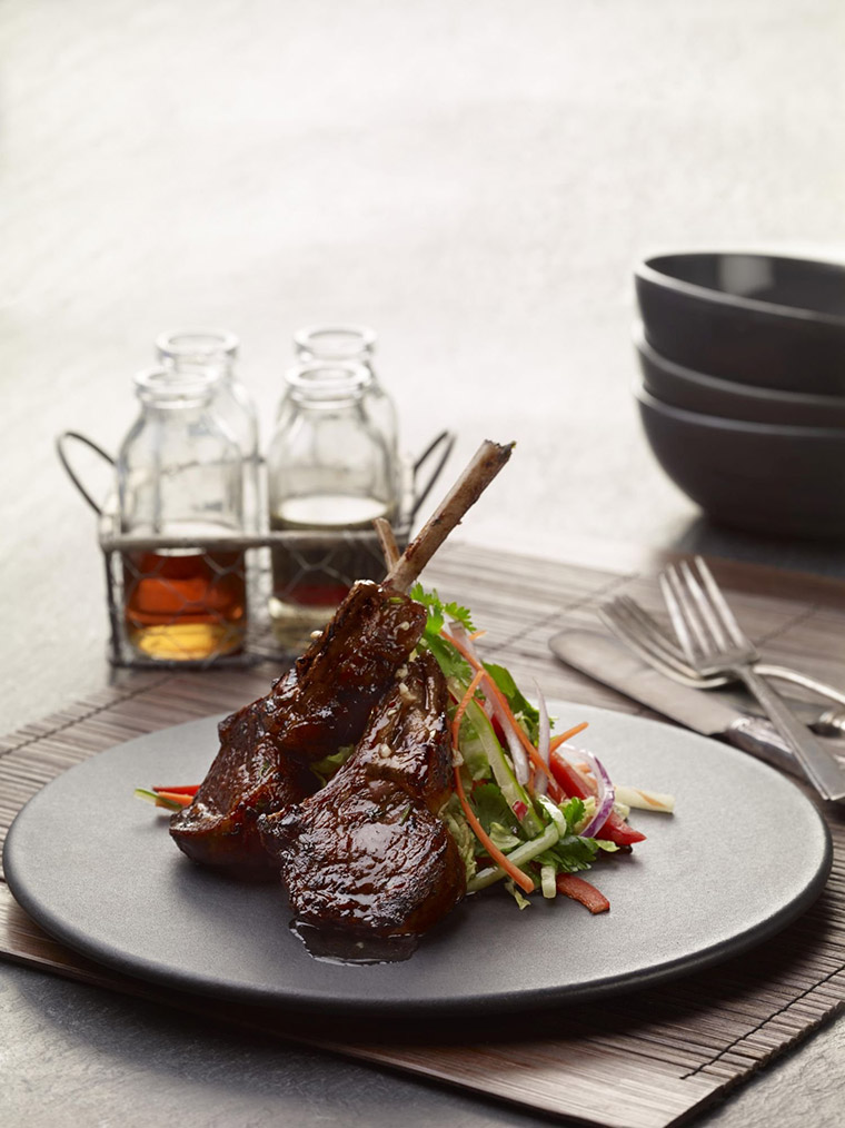 Here’s a great example of Austral-asian cooking—the perfect partnership of Aussie lamb chops treated to a tamarind-based Asian marinade and some crunch-tastic slaw.