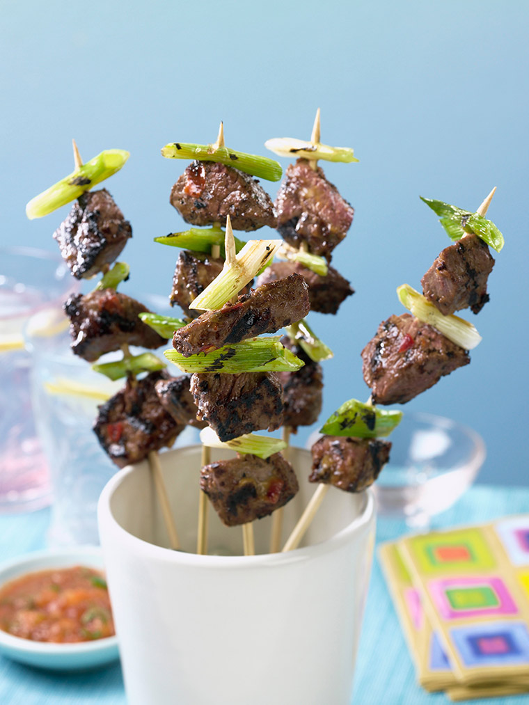 Soak 10 bamboo skewers in cold water 20 minutes to prevent burning. Remove beef from satay sauce, brushing off excess, and thread onto skewers alternately with green onions. Heat a barbecue or grill to high and cook skewers, turning for 4-5 minutes or until cooked as desired.