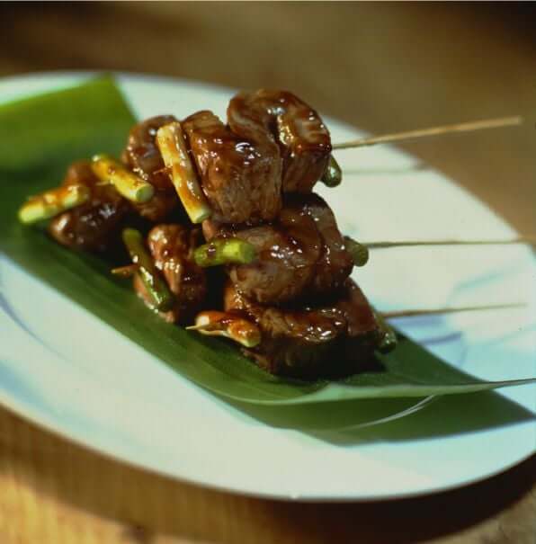 Weave a strip of meat onto each skewer inserting a piece of shallot at either end. Brush with honey and soy marinade and leave to marinate in refrigerator until ready to cook (overnight if you have the time).