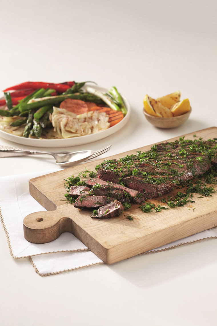 Combine dill and parsley on chopping board and coat steak with the mixture. Thickly slice and place on plates with the grilled vegetables.
