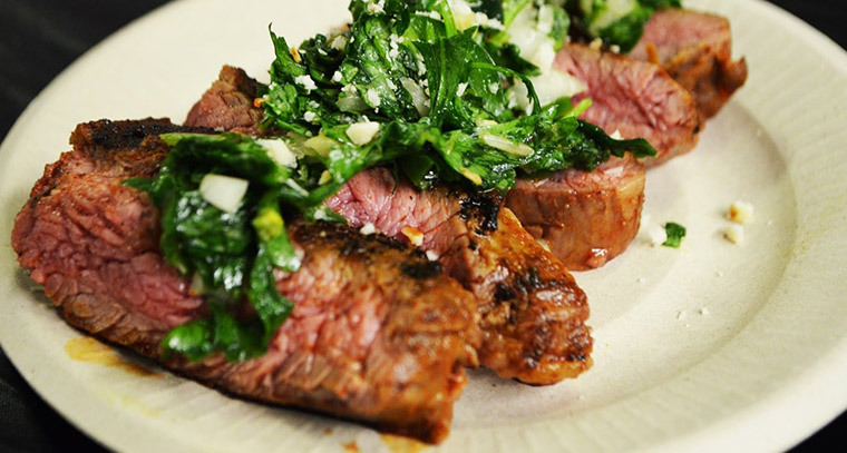 Chef Will Staten Cajun seared grassfed flank steak with spiced chimichurri sauce