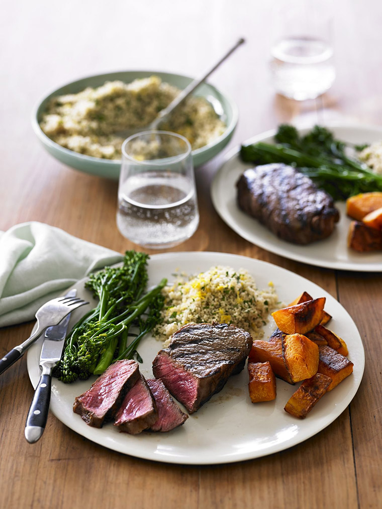 MLA Charred Aussie beef sirloin, pumpkin, broccolini and herb couscous