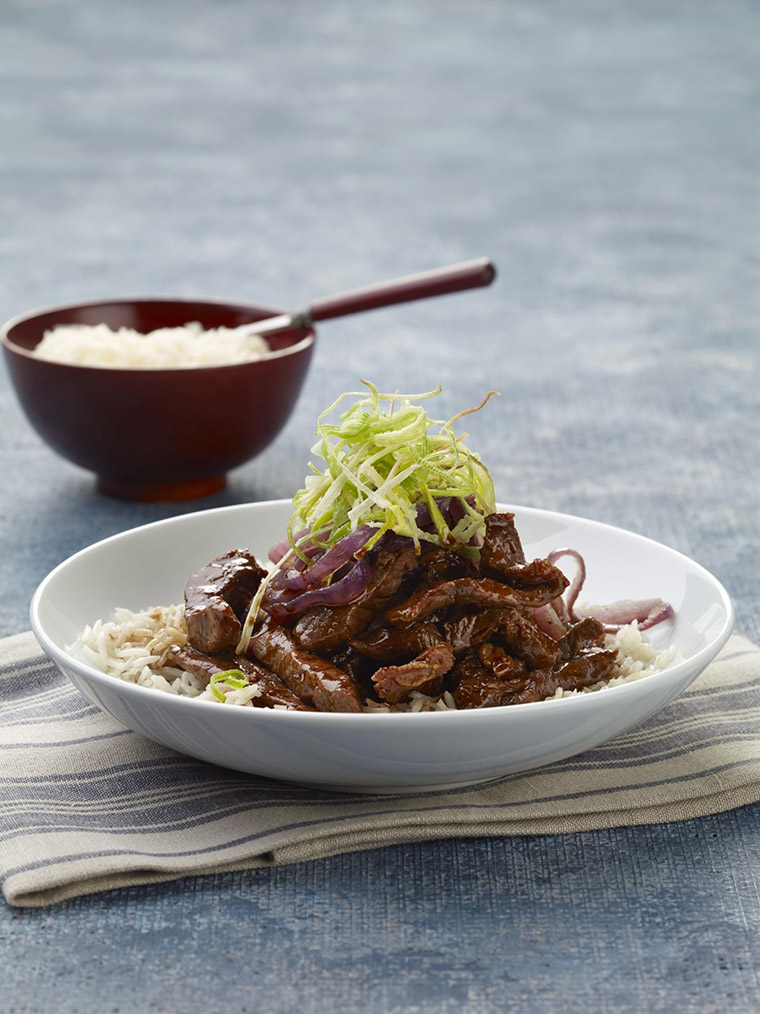 For the fried leeks: Heat the oil in a sauté pan over MEDIUM heat, until it reaches 350 degrees F on a deep-fry thermometer. Toss the julienned leeks with the cornstarch. Season with salt and pepper. Fry them until light brown, stirring them to cook evenly. Remove the leeks with a slotted spoon and lay them on a paper towel to absorb excess oil. Season for final flavor with salt and pepper and set aside. Add the stir-fried onions to the beef and season with salt and pepper to taste. Serve the beef hot over rice and top with the fried leeks.