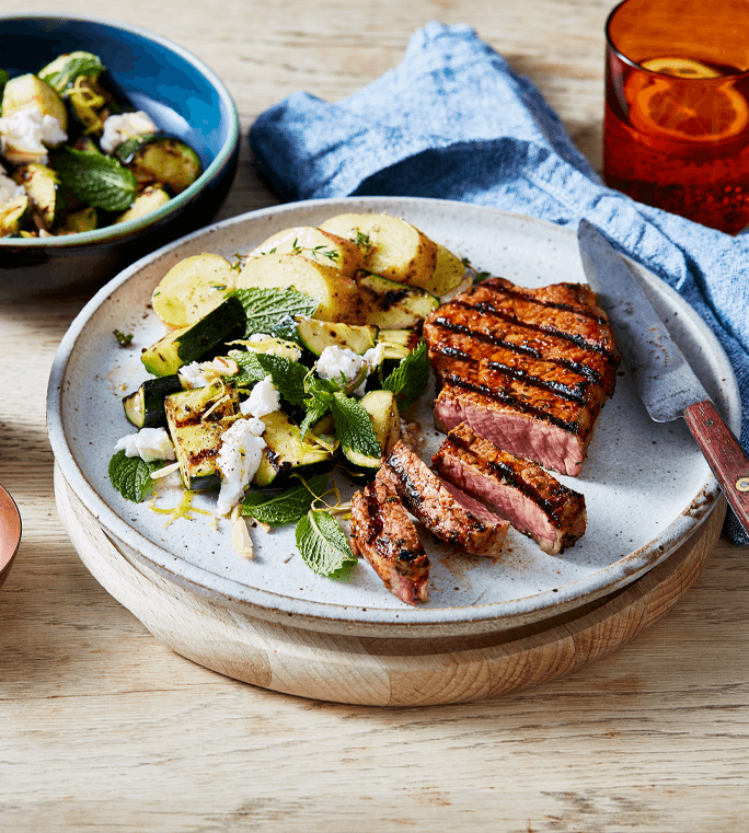 Throwing some steaks and summer veg on the barbie – aka the grill – is as easy as it is tasty; adding the complex heat of North African harissa paste into the mix takes it to another level with no extra work.