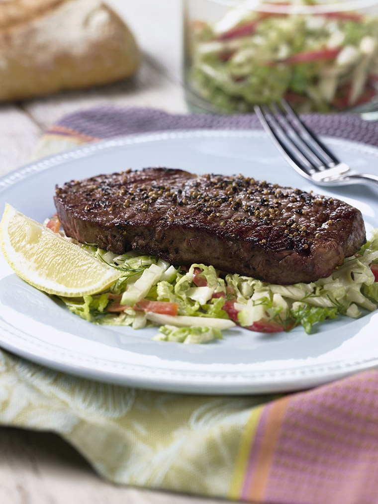 Looking for a recipe for delicious sustainable beef? Try this one - Mustard-Pepper Australian Beef with Creamy Coleslaw.