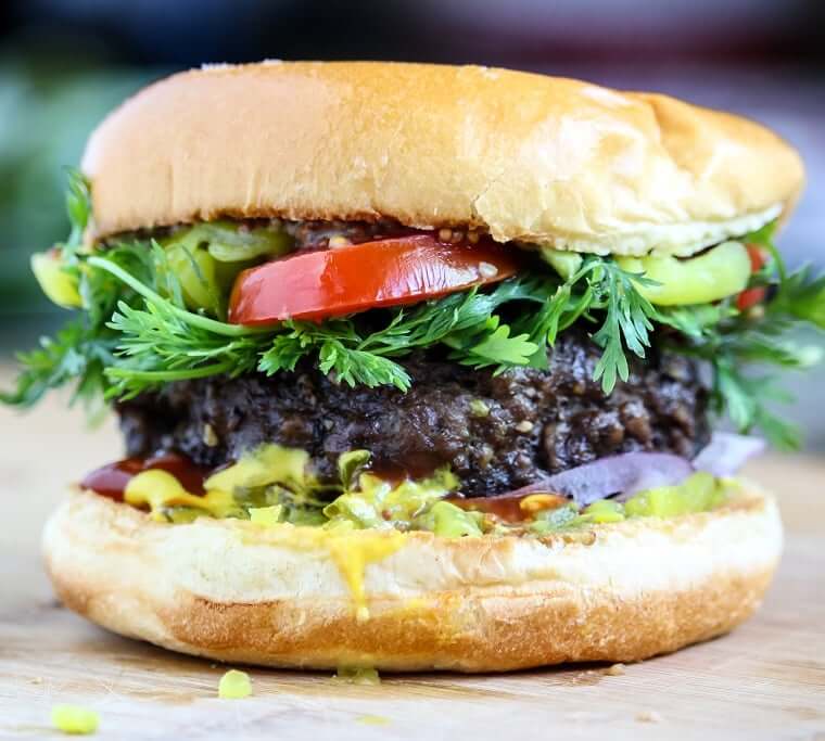 For the burger: Lightly mix the ground beef with grated garlic, Worcestershire Sauce, and salt. Form ground beef into 7 (6-ounce) patties. Sprinkle patties with Montreal seasoning and gently press your thumb in the middle of each patty. Then they are ready to grill!