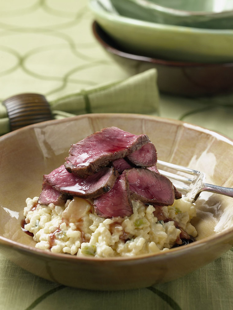 To Serve: Spoon risotto into large bowls. Slice steaks, arrange over risotto, then pour over the wine reduction. Serve with more of the Cabernet and a large green salad.