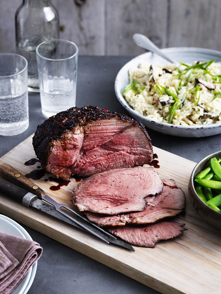 Soy and ginger roast Aussie beef blade with mushroom rice