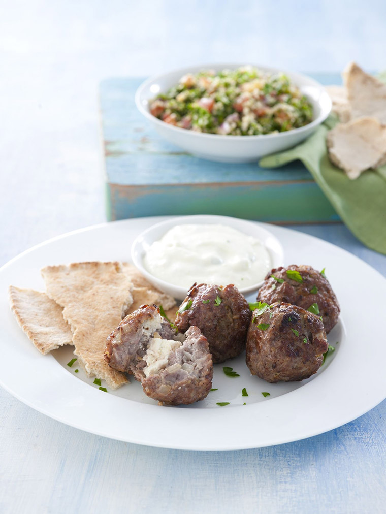 Serve meatballs with tzatziki, tabouli and pita bread.