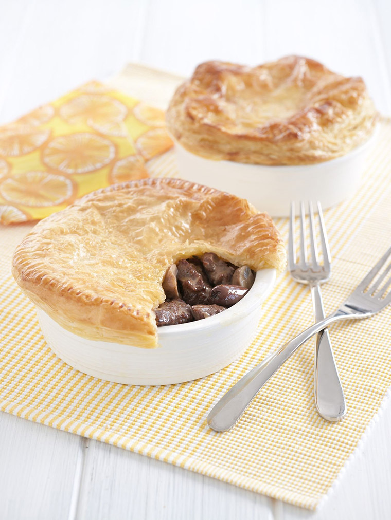 To make the pastry, roll out shortcrust pastry sheets to line the bases of 2 ½" x 5" pie tins. Fill with the cooled goat mixture and top with lids cut from puff pastry sheets. Knock-up the pastry around the edges of the pies and then flute the crust at intervals. Cut a few slits in the pastry and glaze with egg wash. Decorate if desired. Bake for 25-30 minutes at 400ºF.