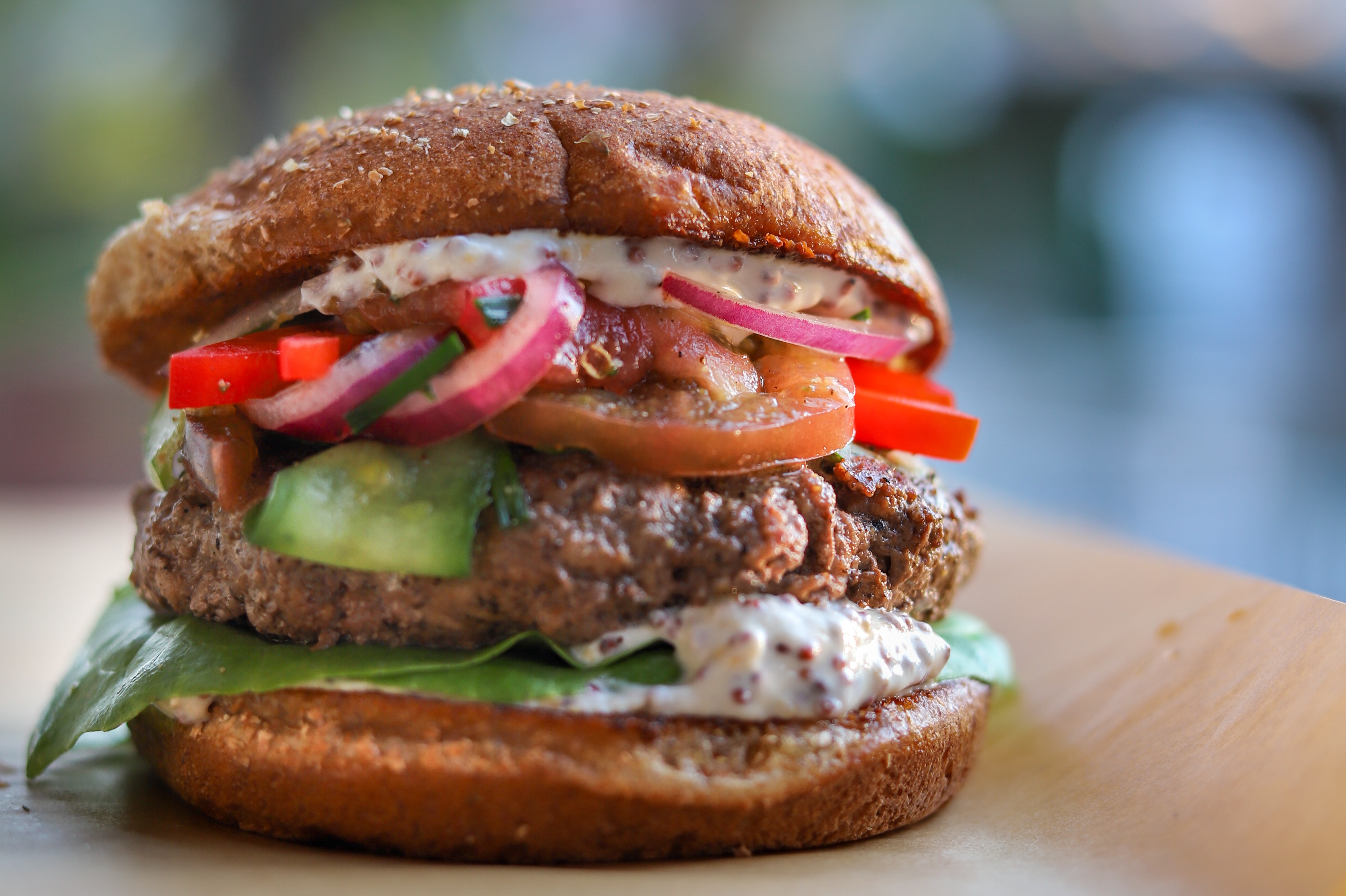 Here's an indulgence you can feel good about - with grassfed beef and a flavorful yogurt-mustard spread, this burger is big on flavor but not the calories!