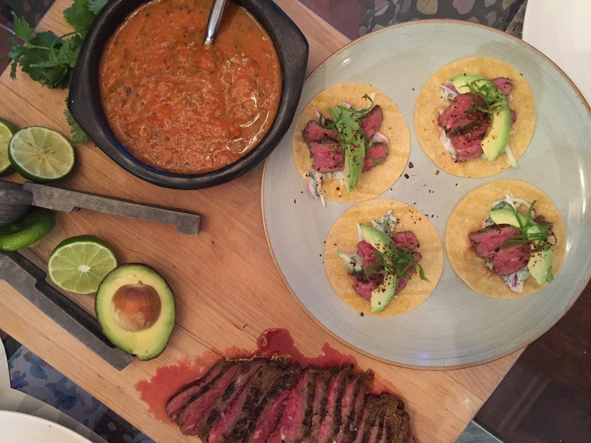 To cook and assemble: Heat charcoal grill until very hot. Season the flank with a little more salt and grill until desired cooking temperature has been reached. Take meat off and rest on an oven rack. Toast the tortillas for a second or two on the grill until fragrant. Place on a plate and assemble with a little slaw, the sliced flank steak, a slice of avocado, cilantro and green onion. Serve with the salsa on top or on the side and lime wedges. Enjoy!