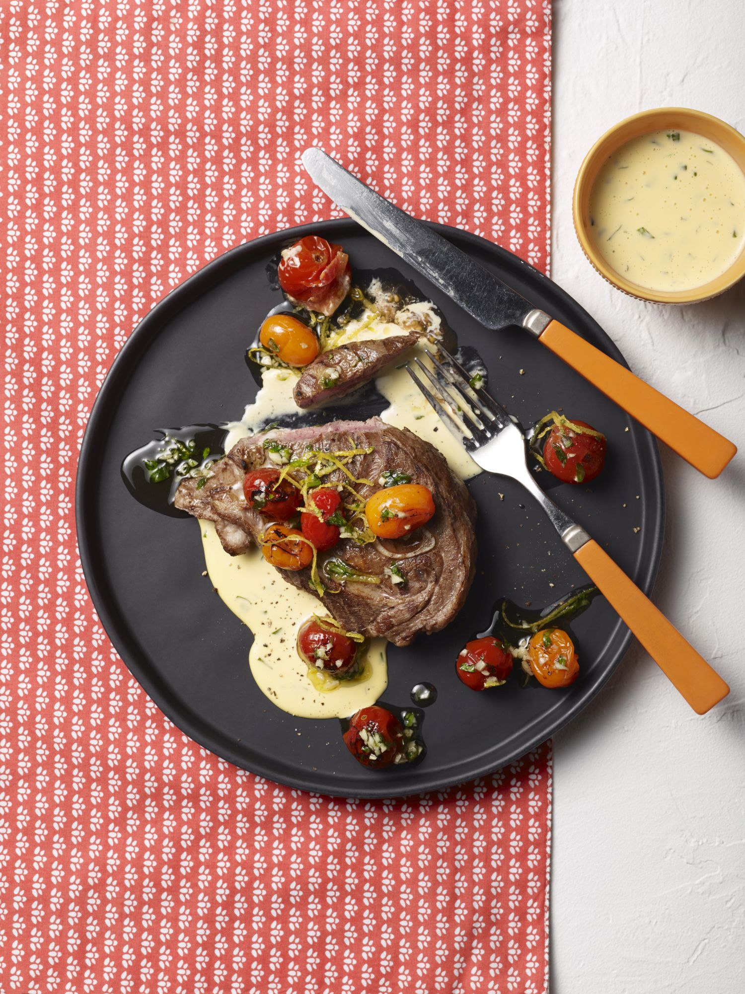 Grilled Aussie lamb with blistered cherry tomatoes and béarnaise