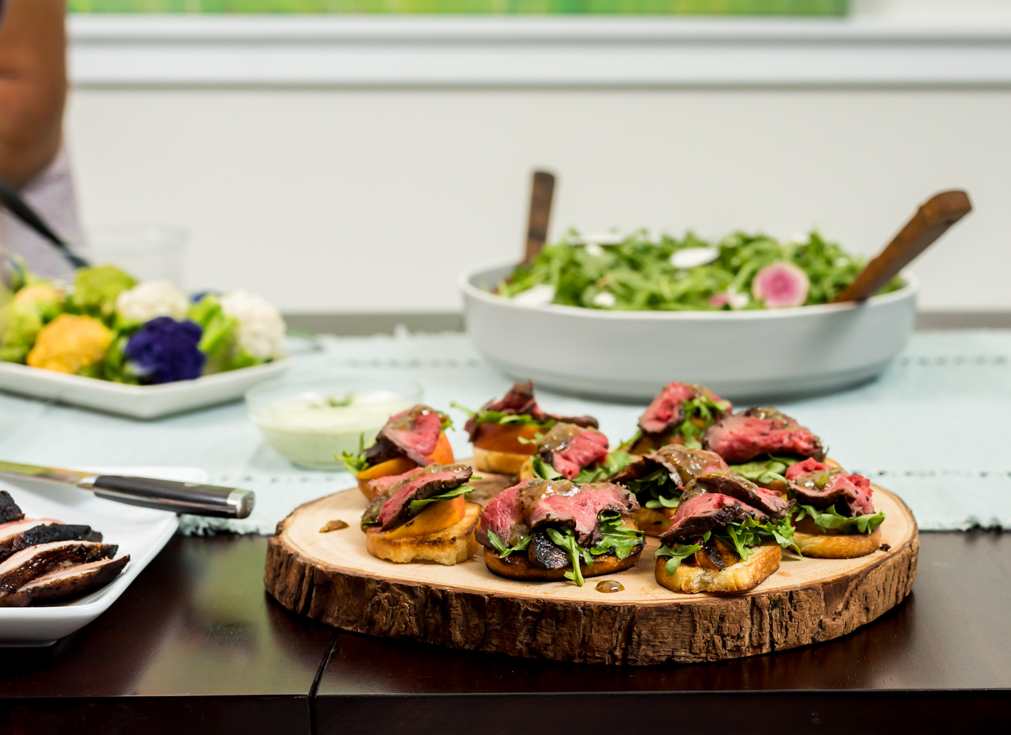 Slice halved peaches into wedges. Place a peach wedge on top of slice of bread, place a small bunch of arugula on top, add salt and pepper to taste. Slice tenderloin into a thin slice and place on top of arugula. Drizzle with mustard glaze.