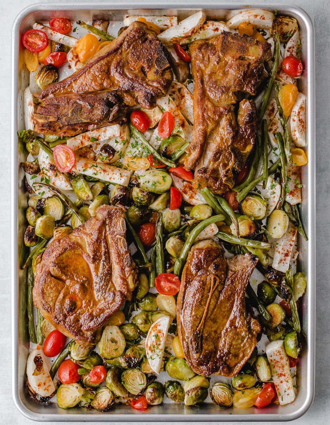 Pre-heat oven to 450 F and combine the brussels, turnips, and green beans on a sheettray and season with 1.5 tablespoons of oil, 1 teaspoon salt, and a few cracks of pepper. Bake the veggies for 25 minutes. Meanwhile, season the Aussie lamb shoulder chops with a pinch of paprika, turmeric, salt, and pepper. Pre-heat a cast iron pan overmedium-high heat and sear the chops until crusty on both sides, about 4 minutes total. Remove lamb and set aside. After the veggies have been baking for 25 minutes, lower the oven to 300 F and place the lamb on the sheet tray, and bake until the internal tempof the Aussie lamb chops is 140 F, about 20 minutes. Allow the lamb to rest for 5 minutes then serve and enjoy!
