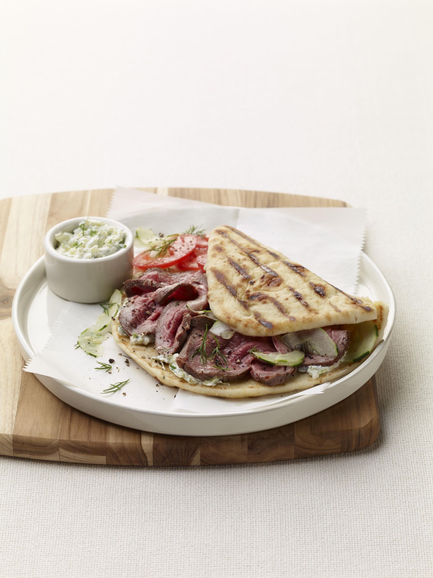 To serve: Place one quarter of the meat inside each pita pocket, top with sliced cucumber, and garnish with tzatziki sauce.